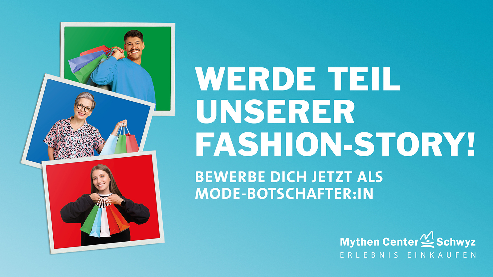 Das Mythen Center Schwyz sucht fünf charismatische Persönlichkeiten aus der Region, die Lust haben, ihre Mode-Leidenschaft zu teilen. Präsentiere deine Lieblings-Outfits, Schuhe und Accessoires in kurzen, authentischen Videos. Wir werden dich filmen und machen dich, unabhängig von Alter oder Erfahrung, zum Gesicht unserer Social Media-Kampagne.