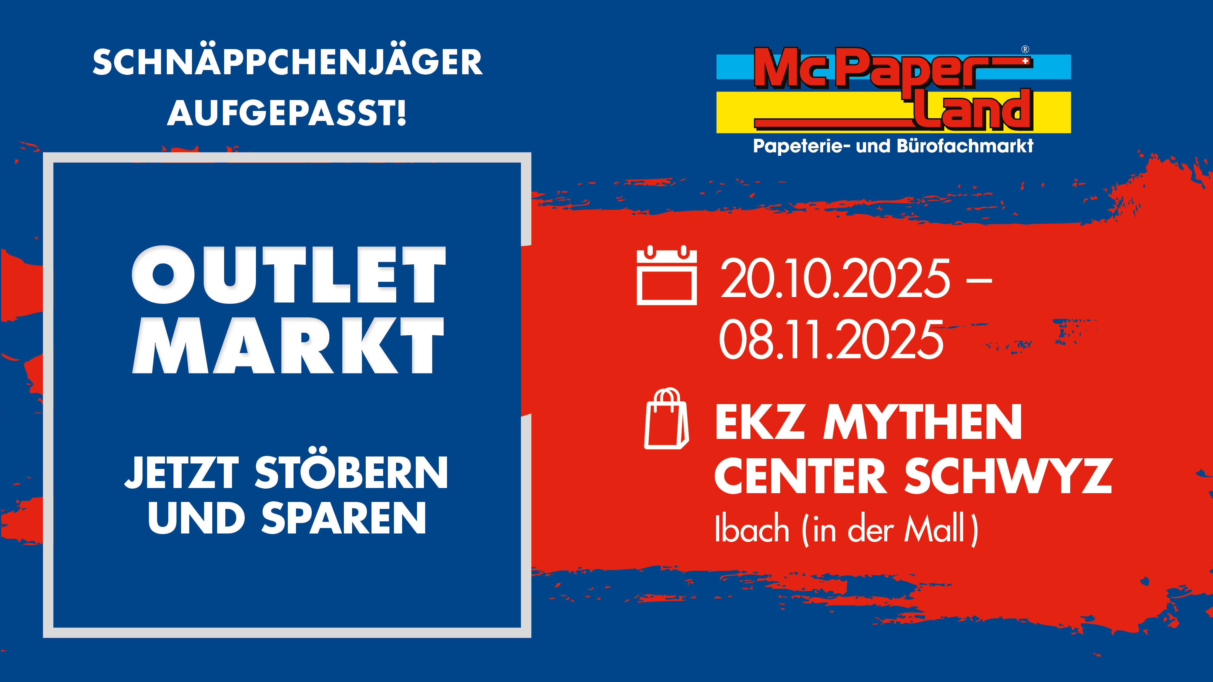 Wir laden Sie herzlich ein, den attraktiven Outlet Markt von Mc PaperLand im Mythen Center Schwyz zu besuchen. Vom 20.10. - 08.11.2025 bietet Mc PaperLand Ihnen eine grosse Auswahl an Produkten für jeden Bedarf. Das Sortiment umfasst allerlei Büromaterial und praktische Schulartikel, die sowohl für Schüler als auch für Lehrer nützlich sind. Zudem finden Sie bei Mc PaperLand lustige Accessoires und Dekoartikel, mit denen Sie Ihr Zuhause oder Ihren Arbeitsplatz aufpeppen können. Entdecken Sie die vielfältige Auswahl an Spielwaren für Gross und Klein. Ob Puzzles, Gesellschaftsspiele oder Kuscheltiere – hier ist für jeden das Passende dabei. Auch für Badefreudige Kunden hat Mc PaperLand tolle Accessoires für die Ferien. Nutzen Sie diese Gelegenheit, um hochwertige Produkte zu günstigen Preisen zu erwerben. Der Mc PaperLand Outlet Markt bietet Ihnen tolle Schnäppchen und Sonderangebote. Bitte beachten Sie jedoch, dass dieses Angebot nur im Outlet Markt gültig ist und nicht mit der Sparkarte sowie anderen Rabatten oder Aktionen kombinierbar ist.